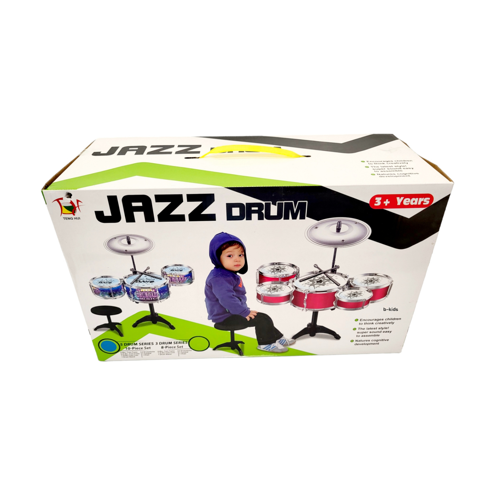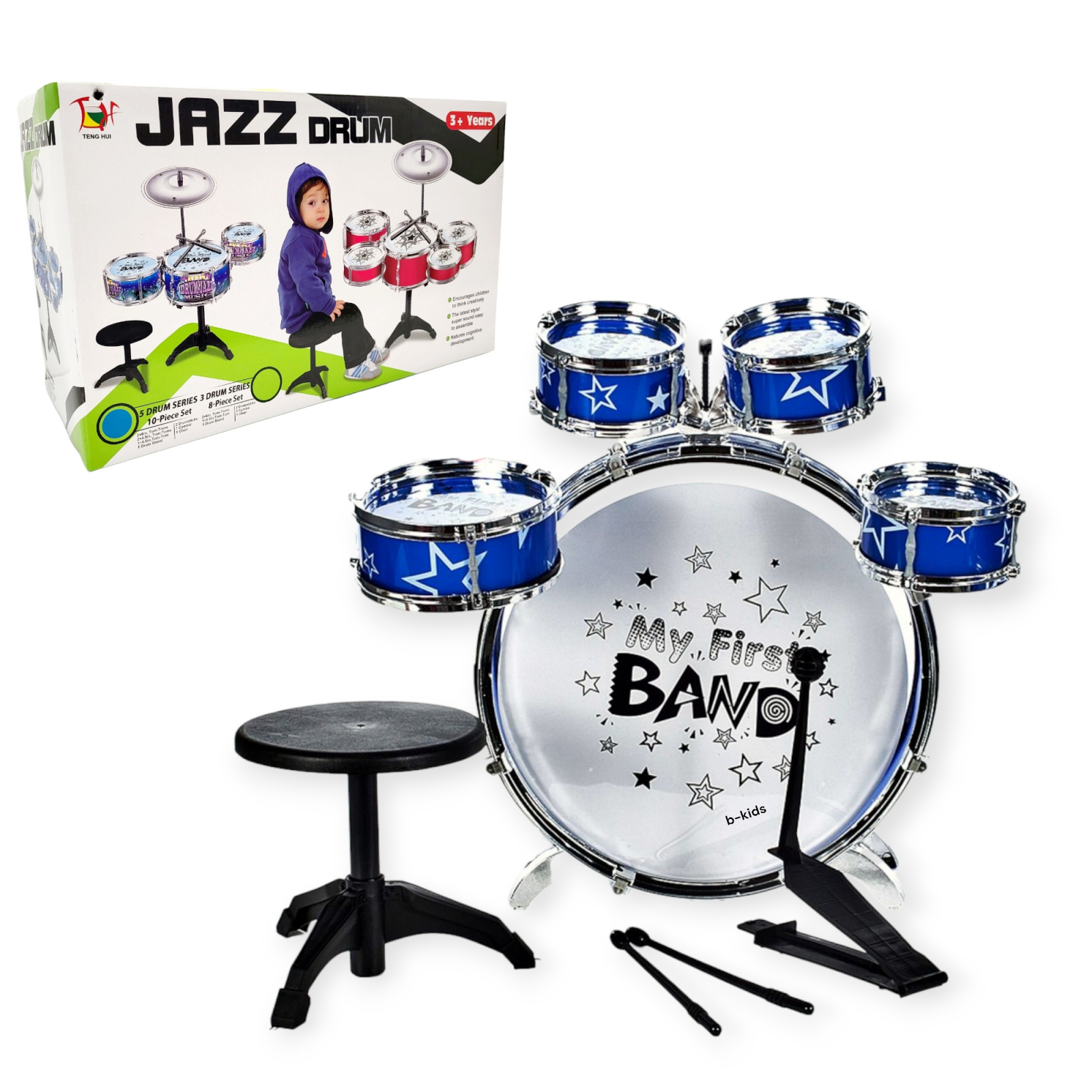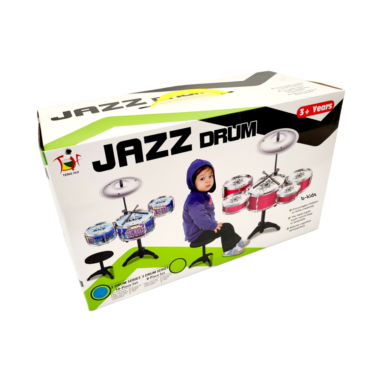 Noul set de tobe Jazz Drum format din 5 tobe si scaunel poate fi cadoul ideal pentru copilul dumneavoastra, sigur se va bucura sa isi dezvolte talentul muzical. Setul de tobe pentru copii este construit special pentru a-i dezvolta copilului creativitatea muzicala.