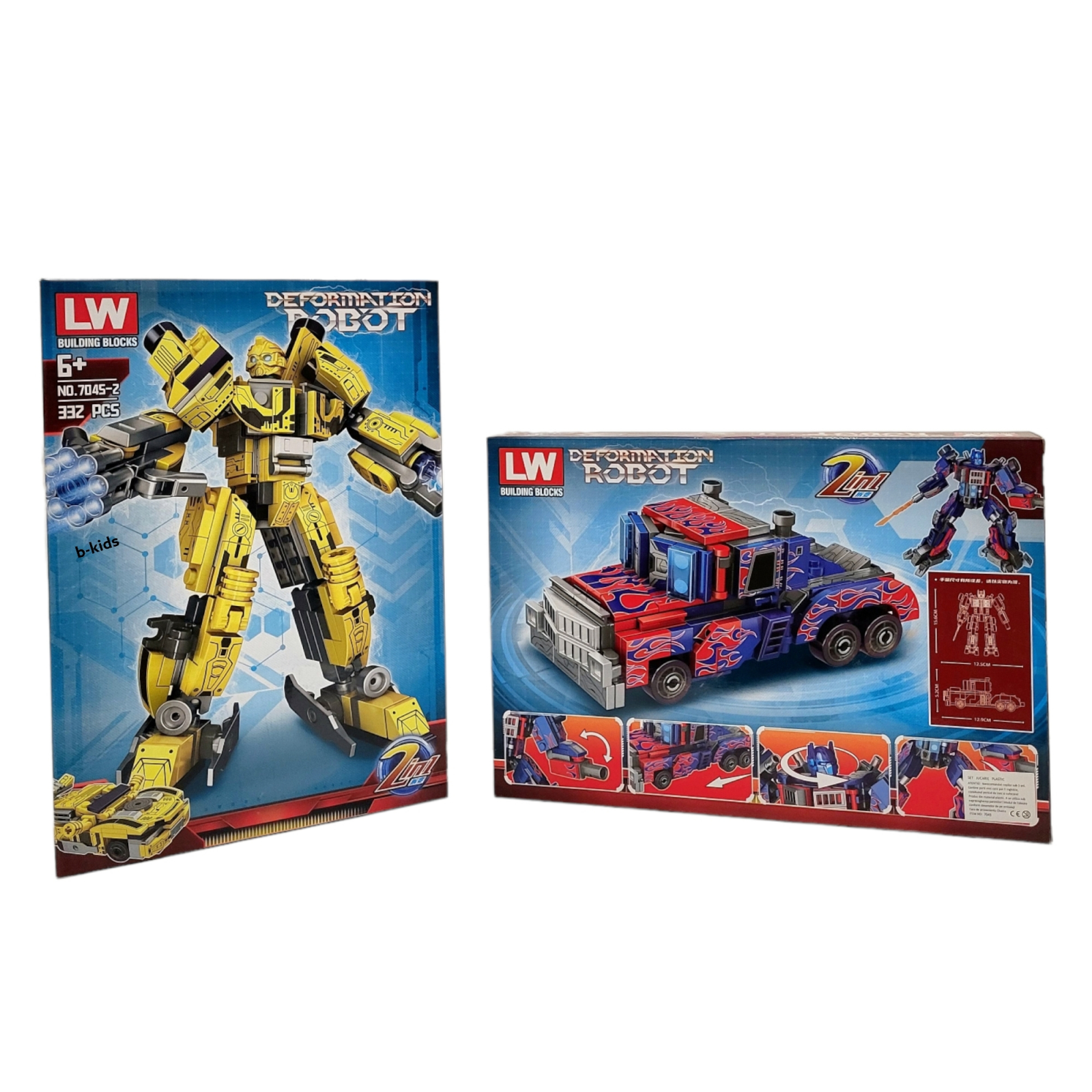 Setul include: 2 cuti ( robot rosu si robot galben ) pentru a construi modelul robotilor, cu detalii impresionante si miscare flexibila a articulatiilor.