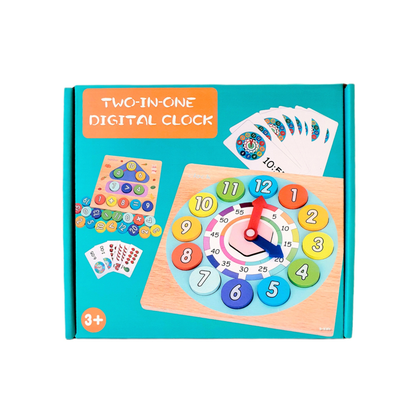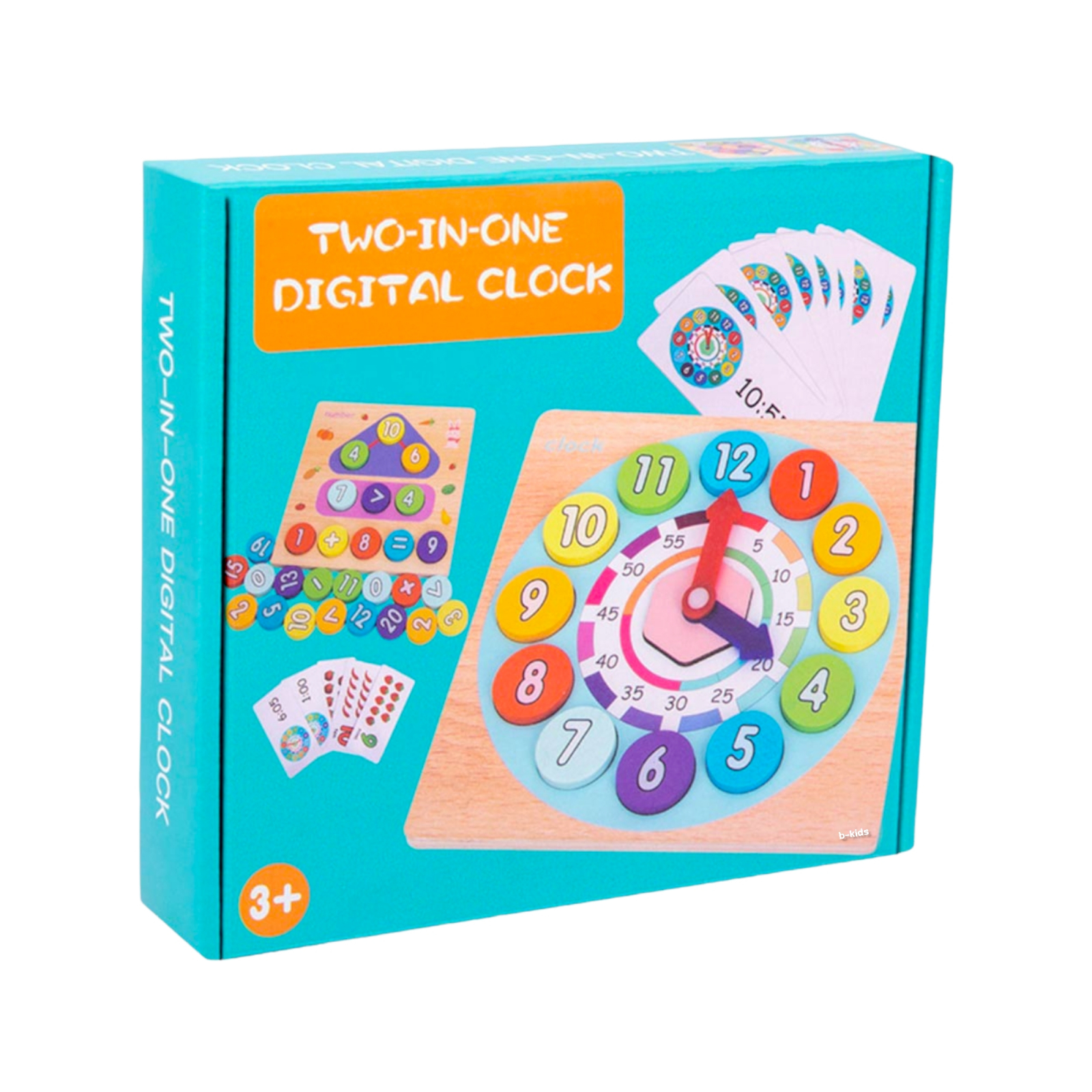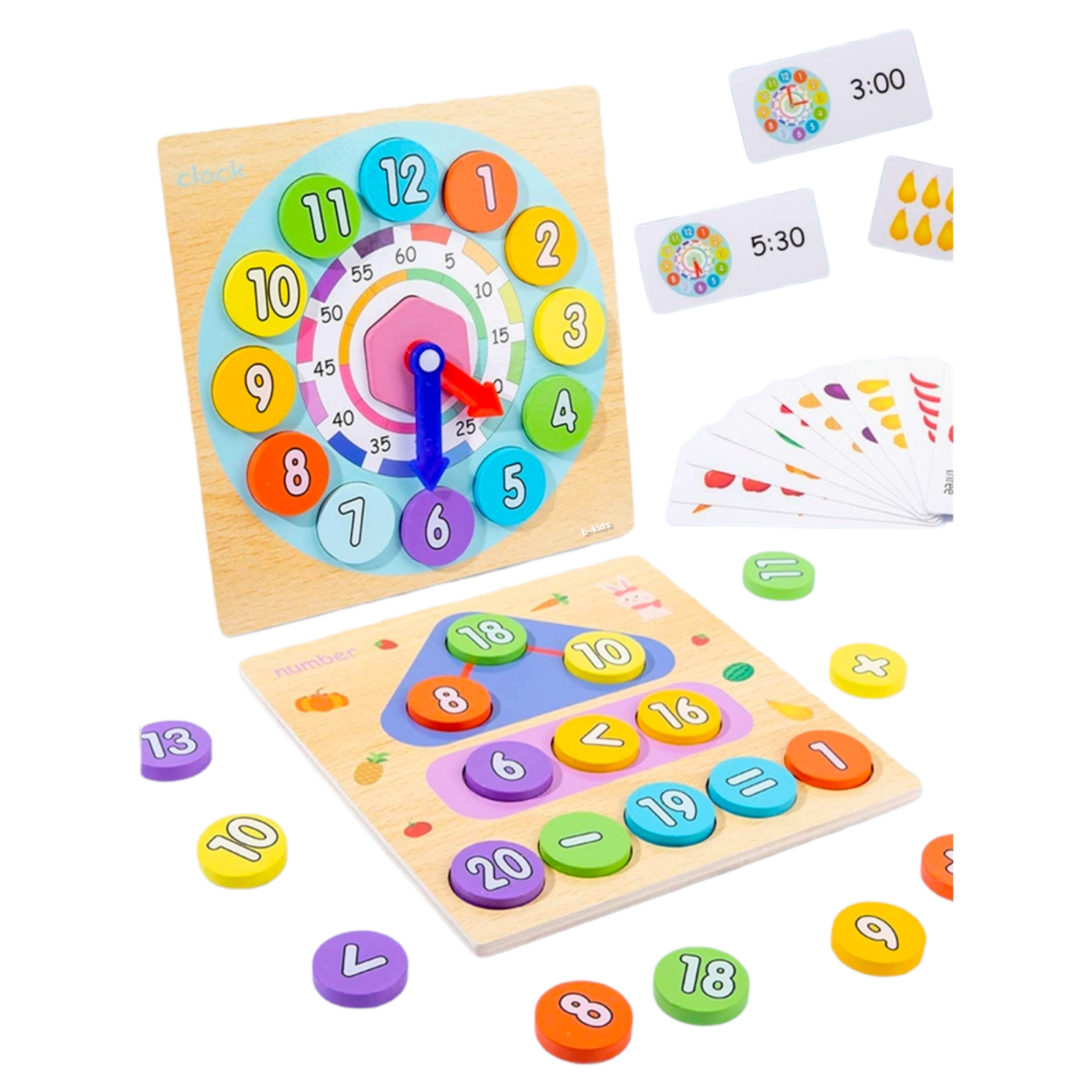● o tablă din lemn cu 2 fețe: față cu ceas de tip puzzle unde cei mici trebuie să introducă jetoanele cu ora și o față unde se pot face calcule și operații matematice folosind jetoanele cu numere.