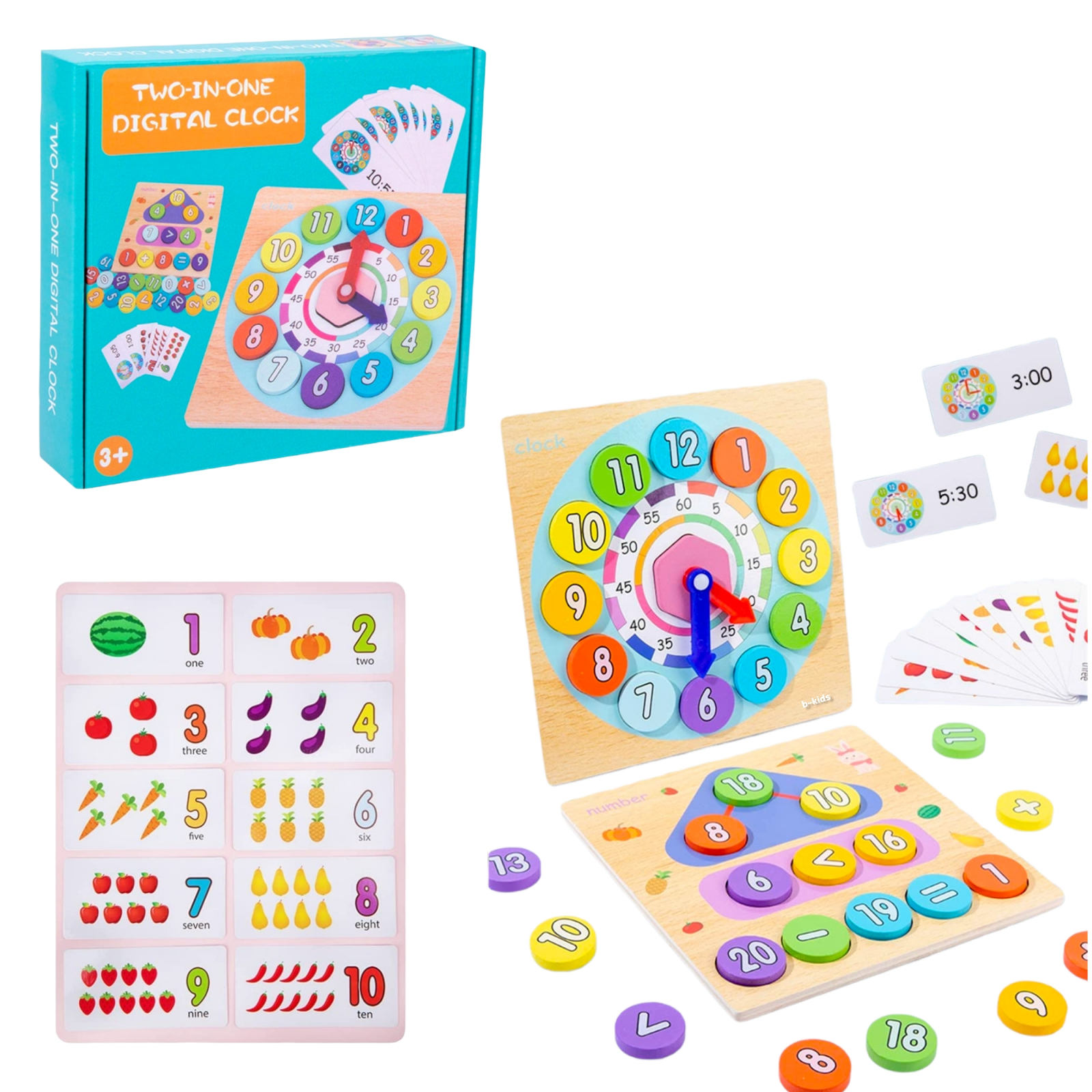 ● set de 10 cartonașe cu fețe- o față cu diferite ore afișate în format analog și digital și o față cu numere și mulțimi de obiecte.