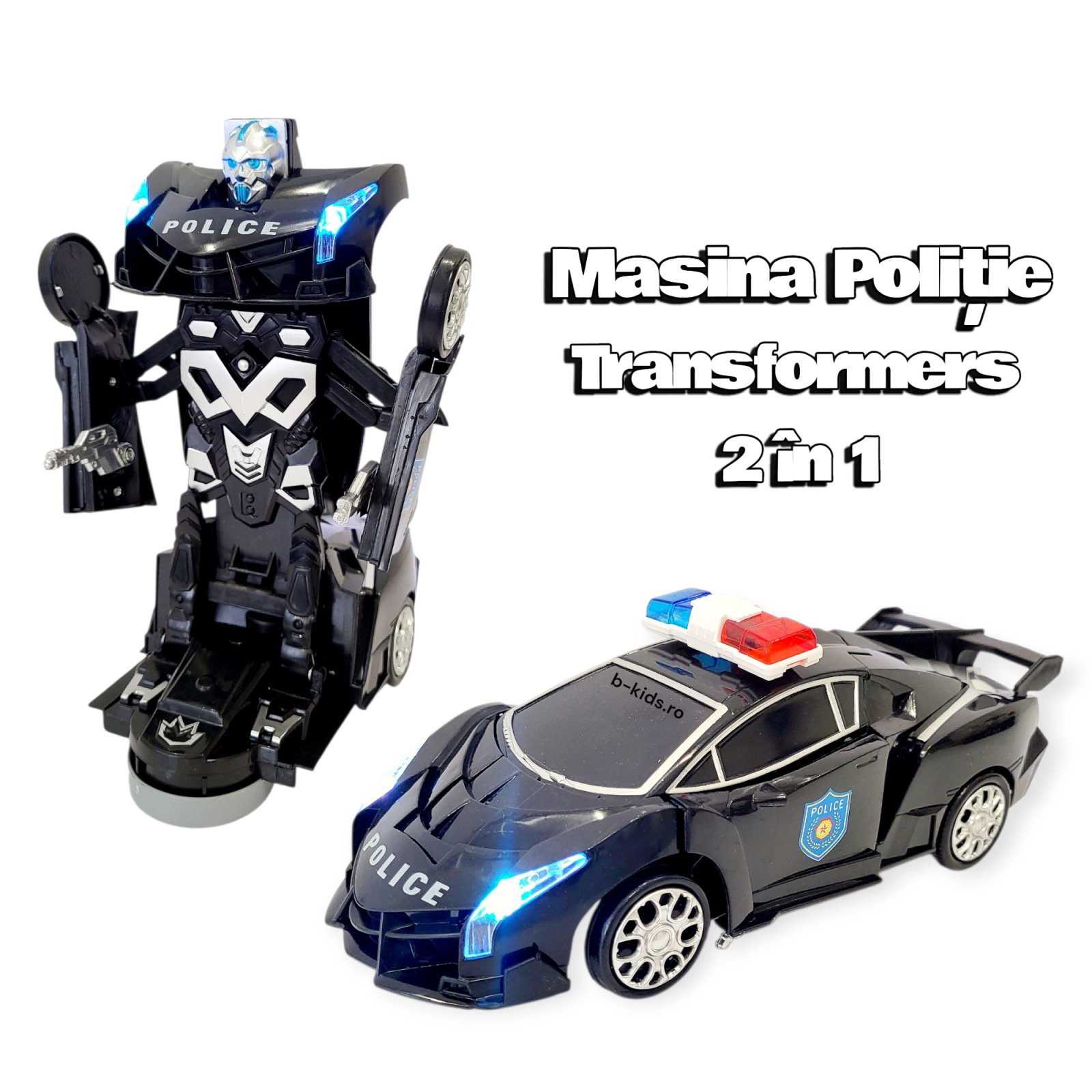 Jucarie masina de politie transformers in robot cu sunete si lumini.